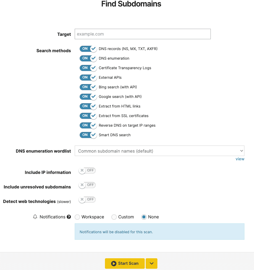 After creating your custom wordlist, go to Find Subdomains, insert your target, select the specific wordlist, and run a focused scan with it. That’s all!