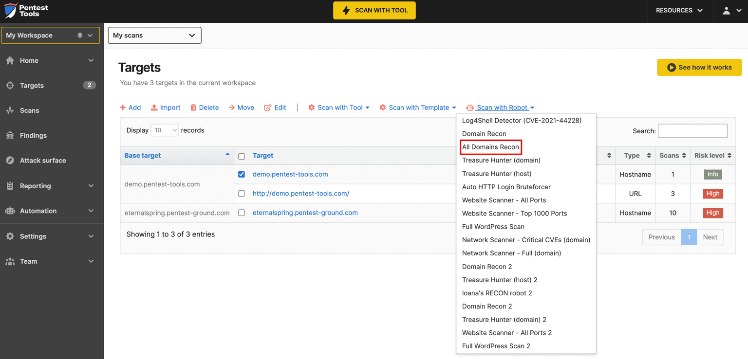 To use it, go to Targets, choose Scan with Robot and run focused scans with the new All Domains Recon Pentest Robot: